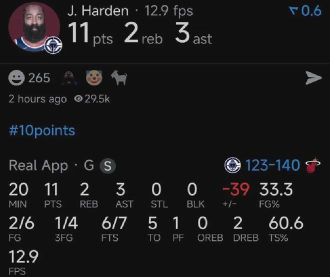 本赛季至今,快船以5胜16负西部倒数第二,哈登出战了其中的20场比赛,场均上阵35.1分钟,贡献26.9分5.7板8.4助4.1失误1断,三项命中率43.5%、36.9%和90.6%。