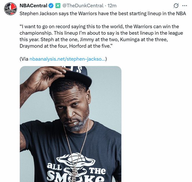 斯蒂芬·杰克逊认为,勇士队拥有NBA最佳首发阵容:“我要公开向全世界宣布,勇士队可以赢得总冠军。我要说的是,这套阵容是今年联盟最佳阵容。斯蒂芬(库里)打一号位,吉米(巴特勒)打二号位,库明加打三号位,追梦打四号位,霍福德打五号位。”